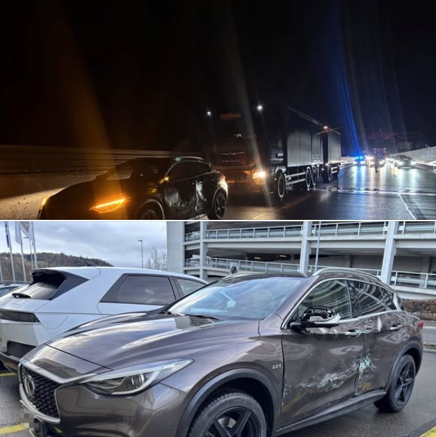 Durch die Kollision drehte sich das Auto um 90 Grad und wurde vor dem Lastwagen hergeschoben, bis sie auf dem Normalstreifen zum Stillstand kamen. Es entstand Sachschaden im Wert von mehreren tausend Franken.