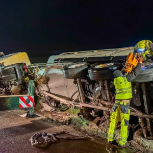 30-Sekunden-Schleuderfahrt enden in spektakulärem Unfall: Autotransporter mit Neuwagen stürzt auf der A9 um