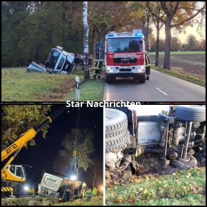 Am Montagnachmittag, 27.10.2025, kippte ein vollbeladener Sattelzug auf der Kreisstraße 11 bei Reddingen (NI) um. Der 67‑jährige Fahrer verlor beim Überholen aufgrund aufgeweichten Seitenraums die Kontrolle. Die Bergung…