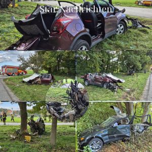 In zwei Teile zerrissen: BMW wird nach Zusammenstoß mit zweitem Auto gegen Baum geschleudert und in zwei Teile zerrissen