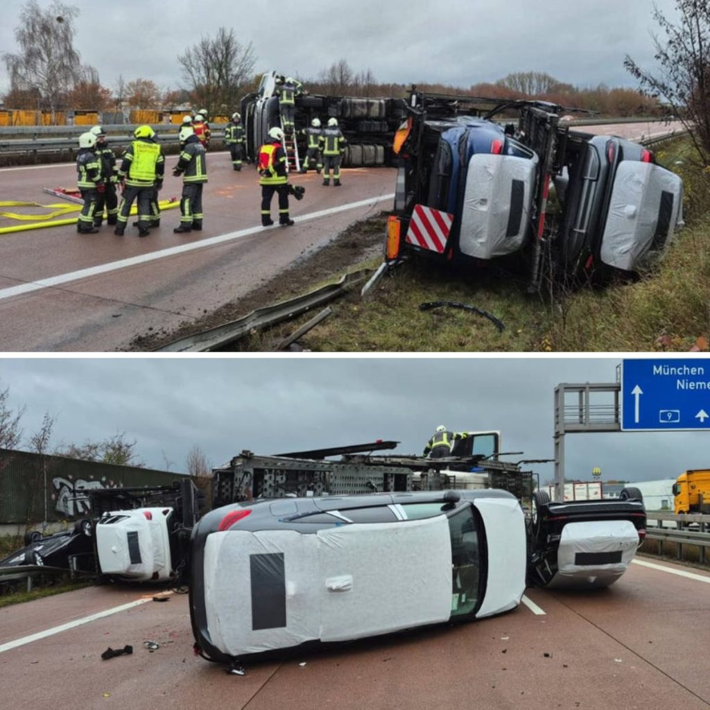 Ein noch größeres Problem stellte jedoch die Ladung dar, denn die bestand aus mehreren Neuwagen, die sich vom Anhänger lösten und über die gesamte Fahrbahn verteilten.