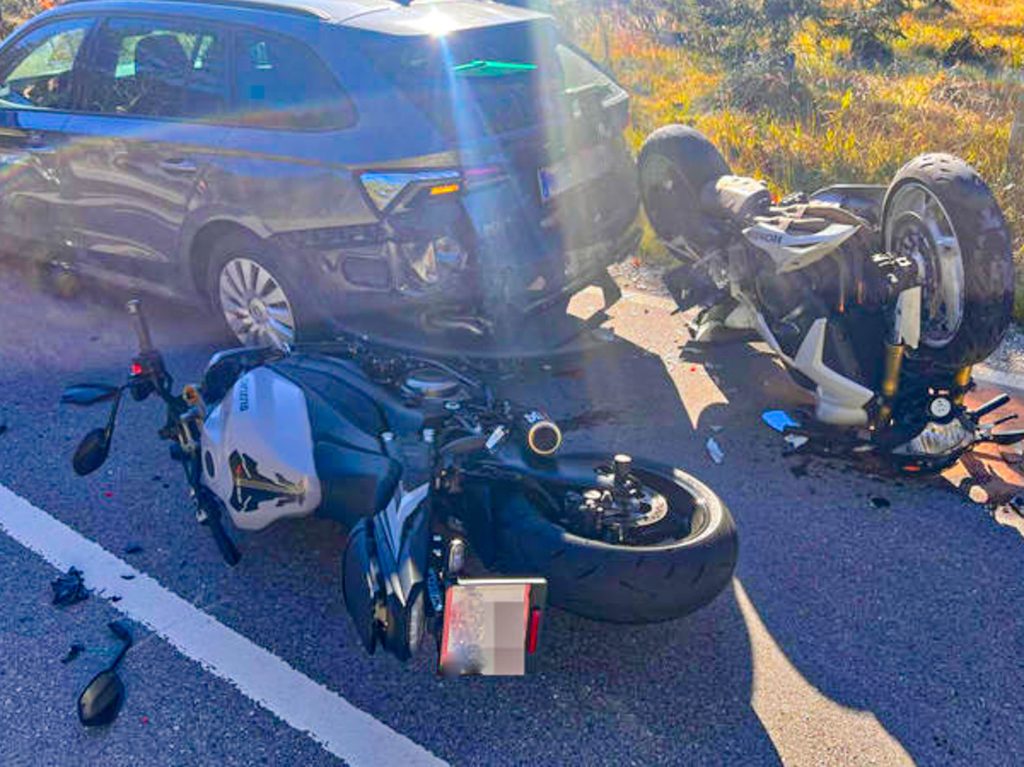 Am Sonntag kollidierten auf der Kreisstraße 24 beim Sylvensteinspeicher (Bayern) zwei Motorradfahrer mit einem Skoda.