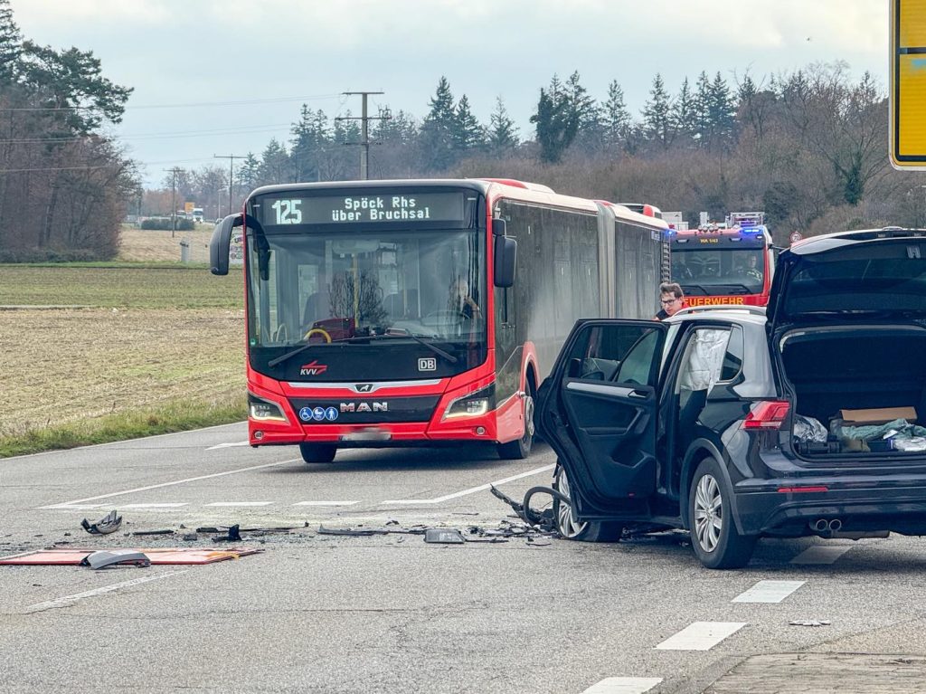 Am Mittwochmittag ist es gegen 12.10 Uhr an der L555, Ecke Haslacher Straße in Waghäusel im Landkreis Karlsruhe zu einem Verkehrsunfall zwischen einem Linienbus und einem PKW gekommen.