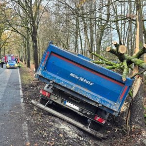 Baum gefällt und Mineralgemisch verteilt: Lastwagen-Gespannt kippt um und landet im Wald