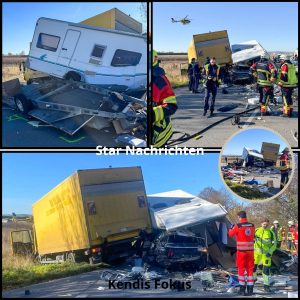 Heftiger Unfall auf Bundesstraße: Wohnwagen landet zerfetzt auf Auto – stundenlange Bergungsarbeiten