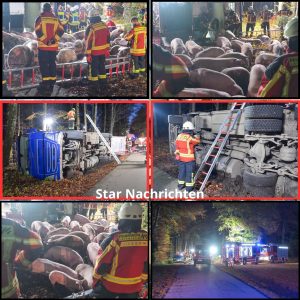 Zahlreiche Schweine verenden bei Lkw-Unfall: Viehtransporter muss Auto ausweichen und kippt am Waldrand um