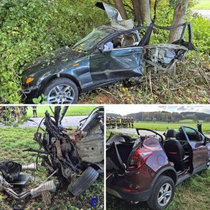 In zwei Teile zerrissen: BMW wird nach Zusammenstoß mit zweitem Auto gegen Baum geschleudert und in zwei Teile zerrissen