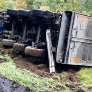 Holzhackschnitzel-Lkw kippt um, Fahrer verletzt