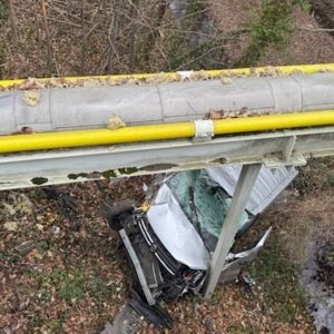 Auto hängt nach Unfall kopfüber zwischen Bäumen