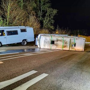 Schwerer Unfall auf B35 bei Bruchsal: Wohnmobil kippt von Anhänger – glücklicherweise keine Verletzten