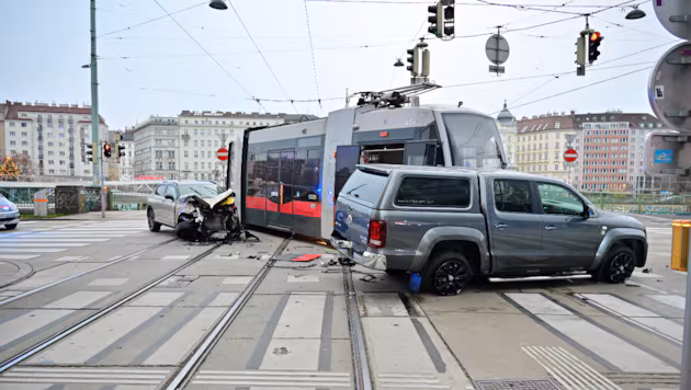 Spektakulärer Verkehrsunfall Sonntagmorgen in Wien-Leopoldstadt: Eine Straßenbahn der Wiener Linien krachte von der Marienbrücke kommend in zwei Autos, die gerade die Obere Donaustraße überquerten. Durch den heftigen Aufprall wurden alle Fahrzeuge stark beschädigt – die Straßenbahn entgleiste sogar.