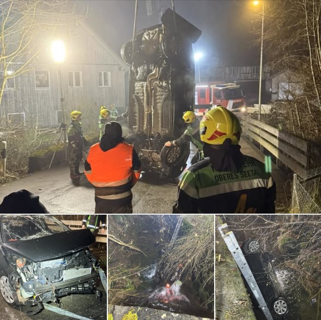 Am Samstag, 13. Dezember 2025, stürzte ein Auto in Fahrwangen in den Dorfbach und blieb auf dem Dach liegen. Ein Anwohner konnte den Lenker aus dem Wagen befreien.