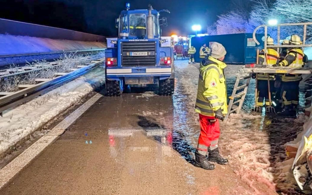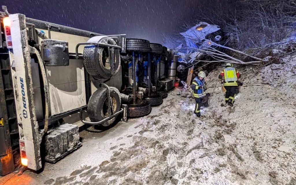 Der Lastwagen war am Freitagabend bei winterlichen Straßenverhältnissen auf der A93 bei Wernberg-Köblitz (Landkreis Schwandorf) ins Rutschen geraten und gegen einen Erdwall gefahren, wie die Polizei mitteilte.
