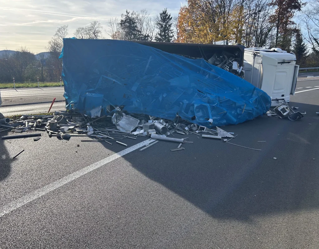 Das Fahrzeug kam mitten auf der Einfahrt zu liegen. Für die Dauer der Unfallaufnahme und der Bergung musste die Einfahrt gesperrt werden. Am Lastwagen entstand Sachschaden von mehreren 10’000 Franken. Der Chauffeur wurde leicht verletzt, er begab sich in ärztliche Kontrolle.