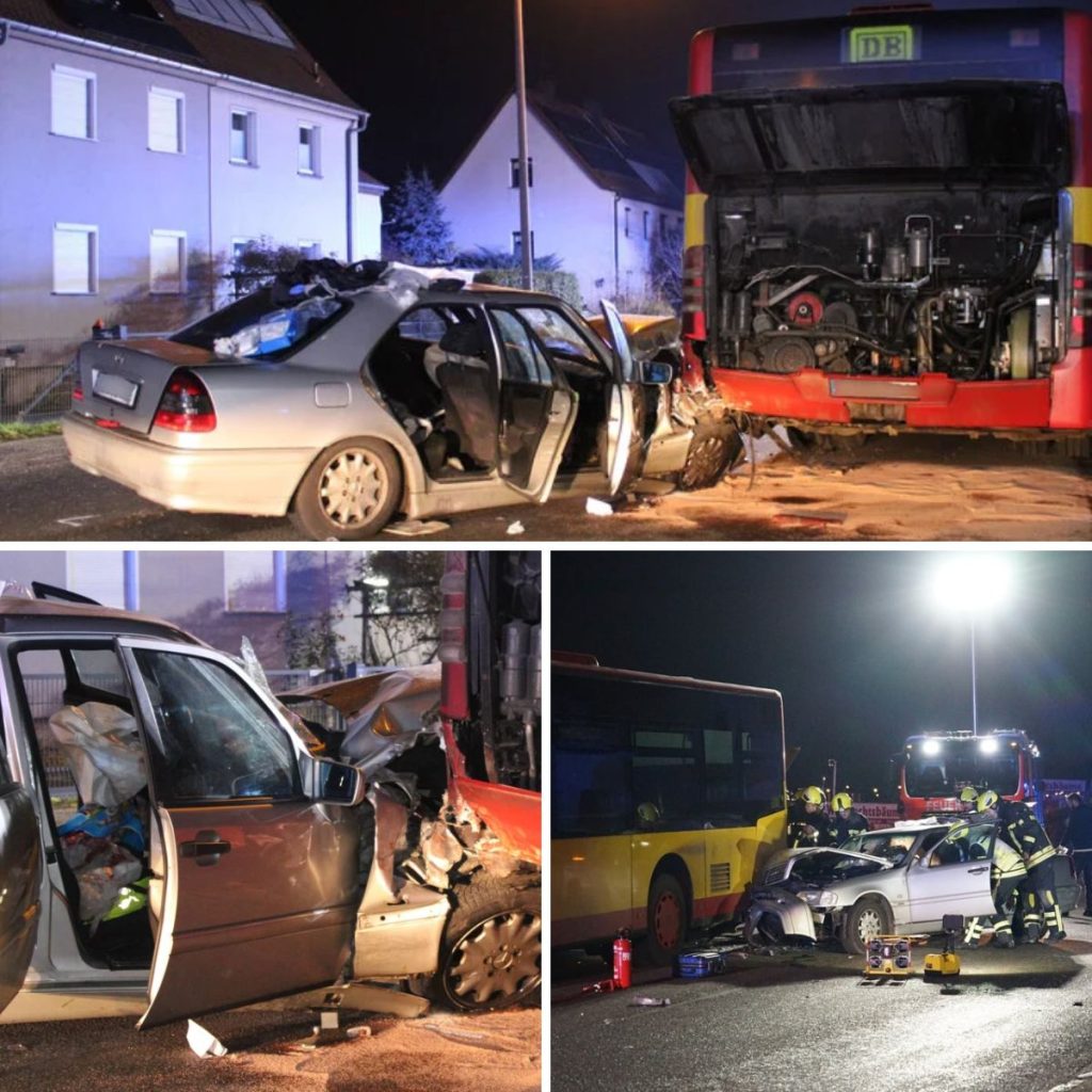 Mercedes kollidiert erst mit Hauswand und kracht dann in Linienbus