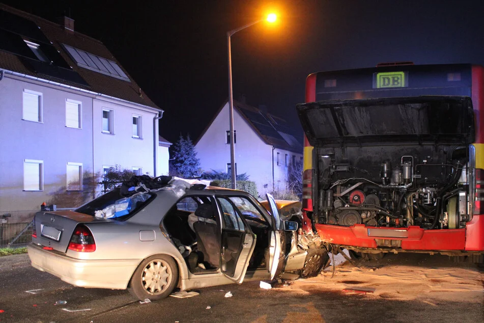Mercedes kollidiert erst mit Hauswand und kracht dann in Linienbus