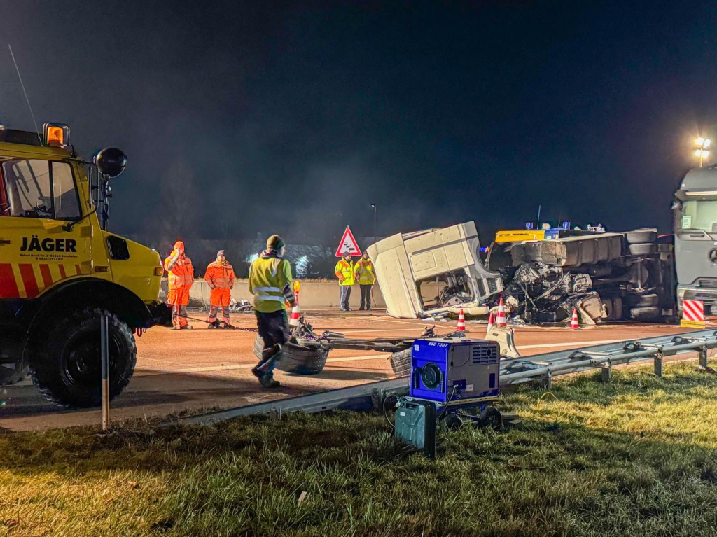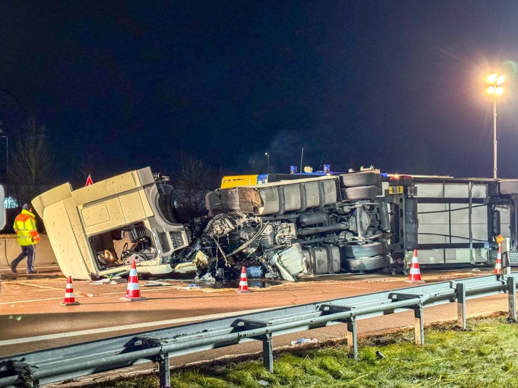Gegen 21 Uhr verlor ein Sattelzug, der aus Richtung München nach Stuttgart auf der A8 unterwegs war, kurz vor der Anschlussstelle Neusäß die Kontrolle. Der 40-Tonner krachte zunächst in die linke Betonleitplanke, geriet ins Schleudern und kippte schließlich um. Dabei wurde das Fahrerhaus abgerissen und nach vorne weggedrückt.