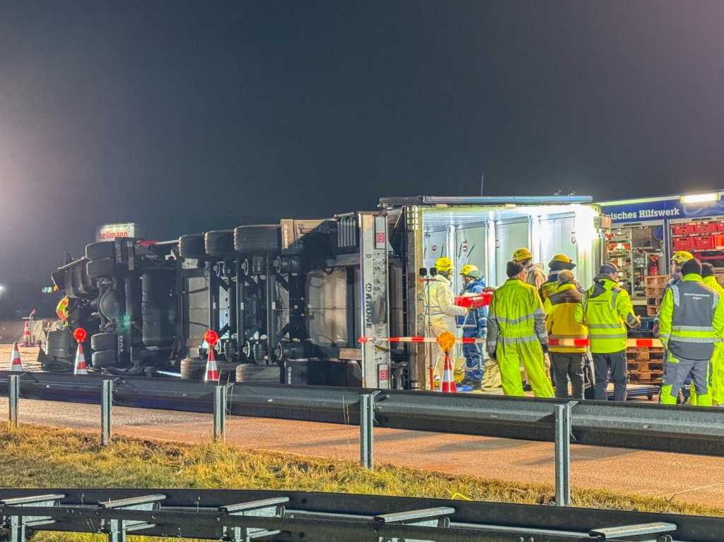 Da der Sattelzug große Mengen an Milch, Käse und weiteren Kühlwaren geladen hatte, mussten die Einsatzkräfte von Feuerwehr und Technischem Hilfswerk den kompletten Auflieger per Hand entladen, bevor ein Kranfahrzeug den umgestürzten Lkw bergen konnte.
