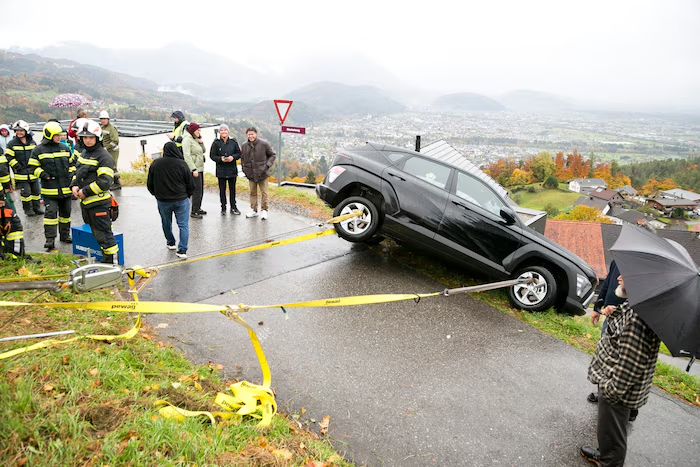 Beinahe wäre der Wagen über eine steile Wiese abgestürzt, glücklicherweise blieb das Auto an der Kuppe hängen. Doch das Zittern ging weiter, denn verlassen konnten die beiden Insassen den direkt vor dem Abgrund baumelnden Wagen nicht. Also setzten sie einen Notruf an.