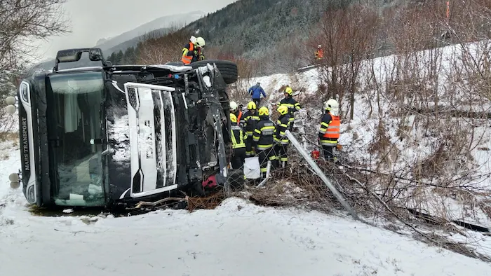Gegen 11.25 Uhr kam ein deutscher Pkw-Lenker bei Gaishorn ins Schleudern. Der Wagen touchierte die Mittelleitschiene und kam entgegen der Fahrtrichtung zum Stillstand. Der Lenker eines Sattelschleppers konnte nicht mehr rechtzeitig reagieren: Das Schwerfahrzeug kollidierte mit mehreren Pkw, durchbrach die rechte Leitschiene und stürzte über eine rund zehn Meter hohe Böschung. Der Lkw kam seitlich zu liegen, Treibstoff trat aus.