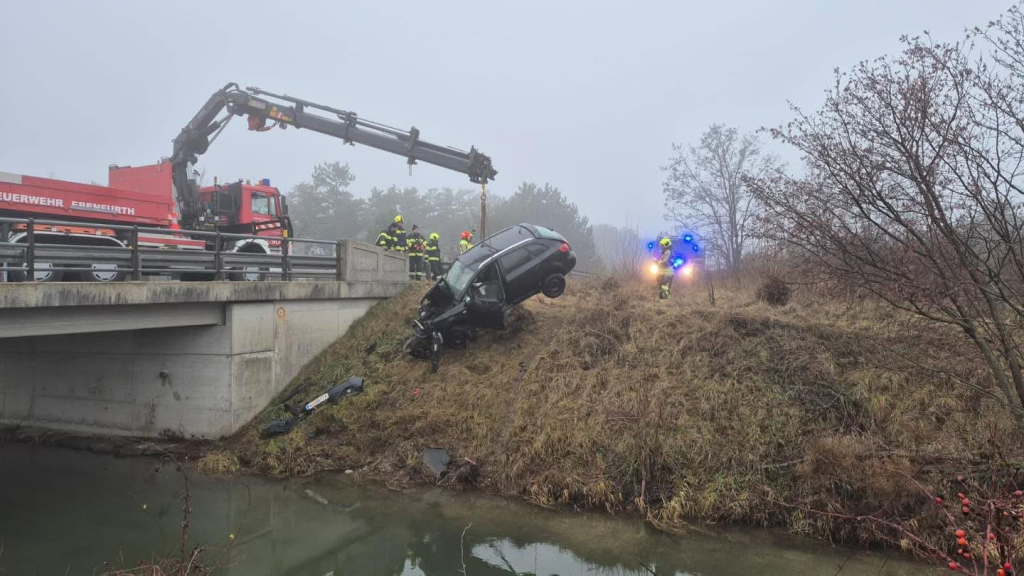 Der PKW schlug anschließend auf der anderen Uferseite ein und kam dort auf der Böschung zum liegen, glücklicherweise rutschte das Fahrzeug nicht in den Kanal ab. Der Lenker wurde beim Unfall verletzt und nach Versorgung durch den Rettungsdienst in ein Spital eingeliefert.