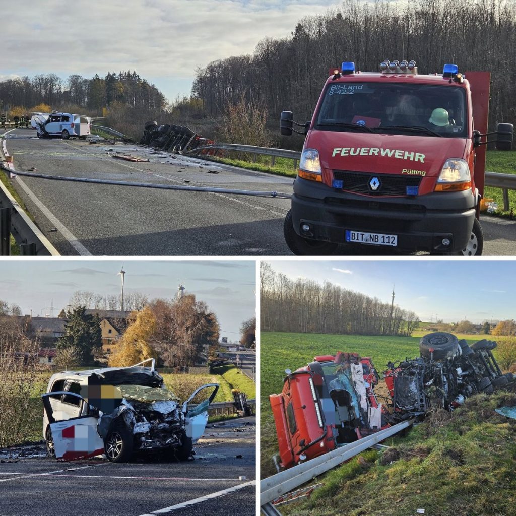 Am Dienstagmorgen, dem 18. November 2025, kam es gegen 9:40 Uhr auf der B51 zwischen Trier und Bitburg, auf Höhe Windmühle, zu einem schweren und tragischen Verkehrsunfall zwischen einem Auto und einem LKW. Die Kollisionskräfte waren so groß, dass die drei Insassen des Autos – ein 45-jähriger Mann, seine 42-jährige Ehefrau und die gemeinsame siebenjährige Tochter aus Bitburg – sowie der 53-jährige LKW-Fahrer aus dem Landkreis Trier-Saarburg noch an der Unfallstelle verstarben. Aufgrund der komplexen und detailreichen Unfallaufnahme sowie der schwierigen Bergungs- und Reinigungsarbeiten blieb die Bundesstraße bis 3:30 Uhr voll gesperrt – nahezu 18 Stunden lang. In beide Fahrtrichtungen kam es zwischenzeitlich zu erheblichen Rückstaus. Für die Dauer der Vollsperrung wurden ausgedehnte Umleitungen eingerichtet, wie die Polizei mitteilte.