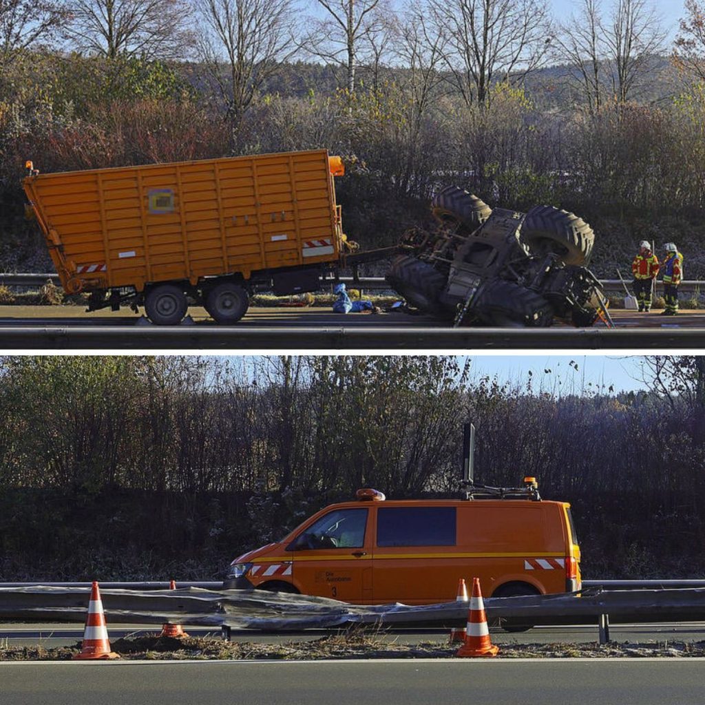 Traktor-Gespann durchbricht auf A8 Mittelleitplanke und kippt um: 400.000 Euro Schaden!