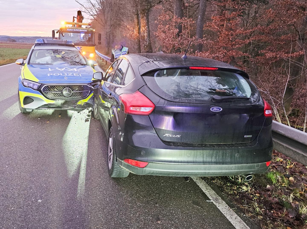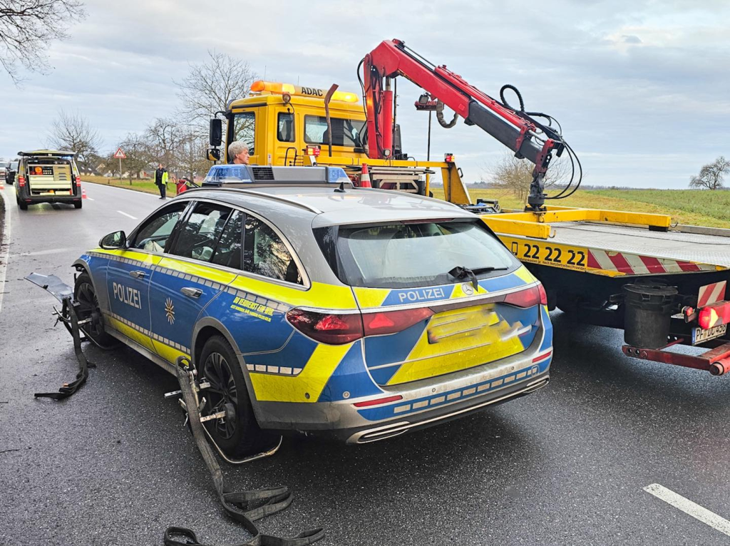 Eine Polizeistreife hatte am Morgen einen Wildunfall kurz vor der Autobahnbrücke aufgenommen und stand mit eingeschaltetem Blaulicht am Fahrbahnrand.