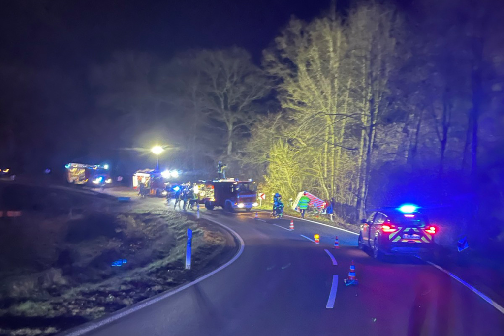 Am Donnerstagabend, 11.12.2025, verunglückte nahe Pluwig (RP) ein Rettungswagen auf der L143. Das Fahrzeug kippte in einer Kurve um, zwei Besatzungsmitglieder wurden verletzt und in Krankenhäuser gebracht. Die Straße war mehrere Stunden voll gesperrt.